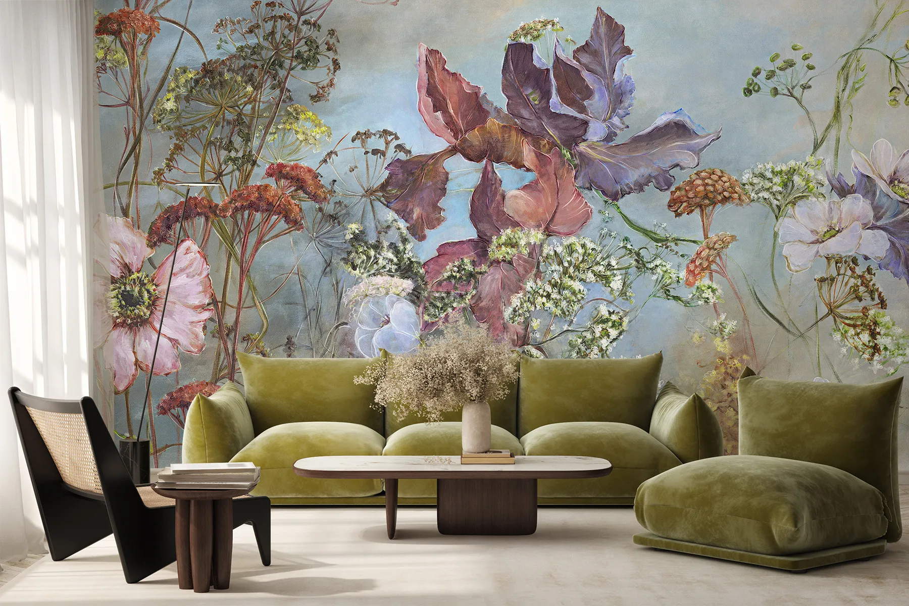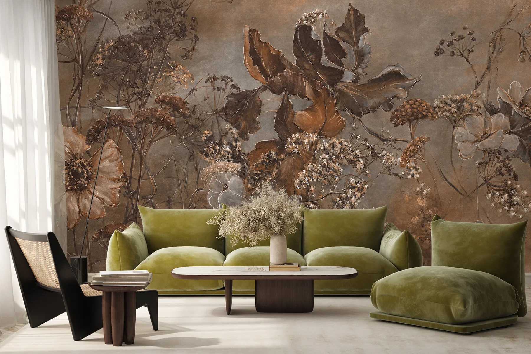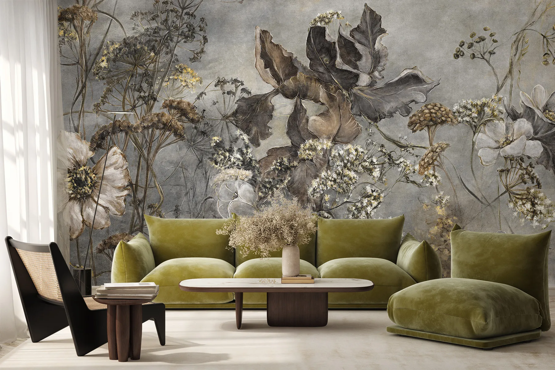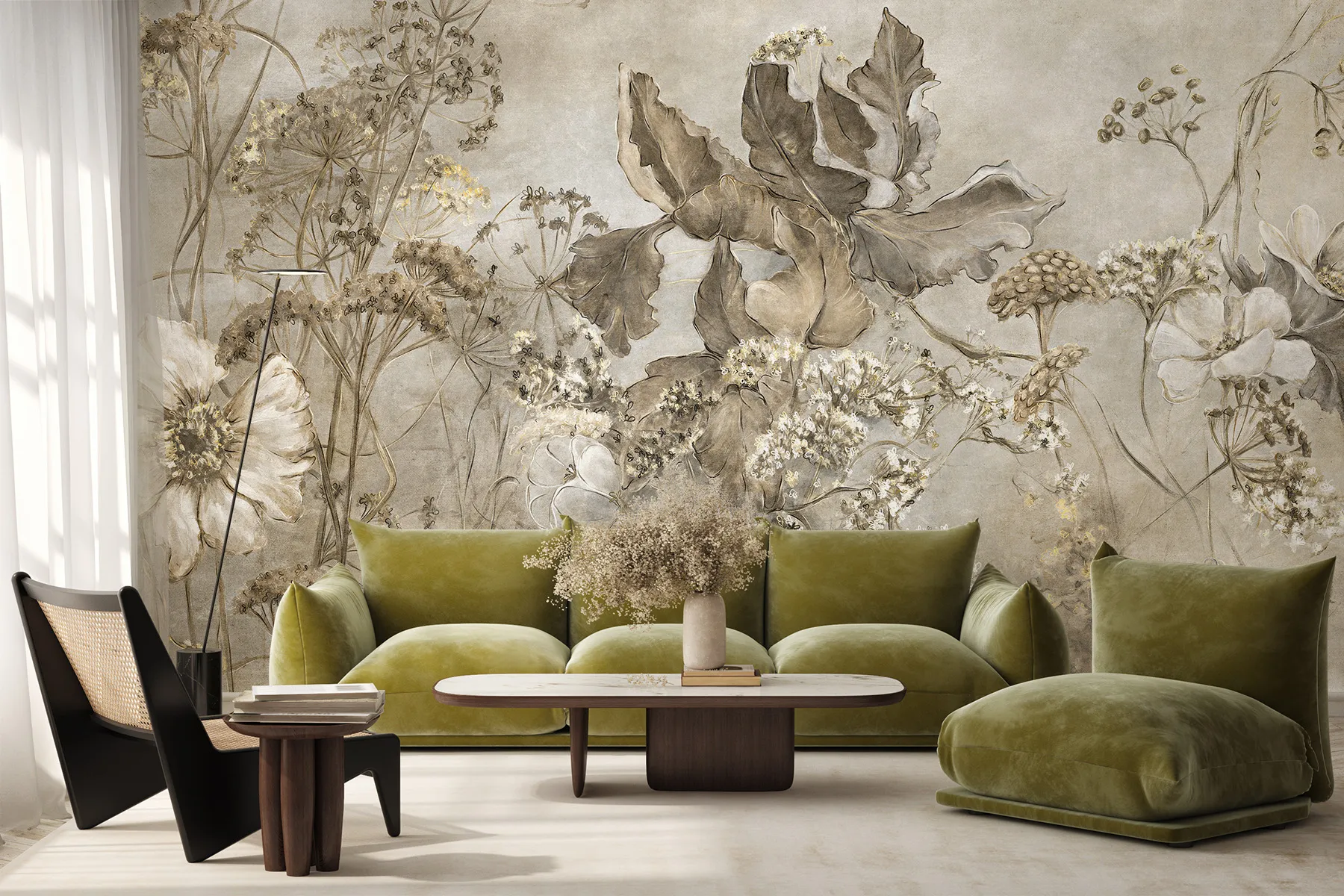 Die Noctiflor-Tapete hat die außergewöhnliche Kraft, einen Raum zu verwandeln. Im Schlafzimmer verwandelt sie es in ein intimes Refugium, ideal für die abendliche Entspannung und einen ruhigen Schlaf. Im Wohnzimmer wird sie zu einer raffinierten Kulisse für Meetings und im Büro zu einer Quelle der stillen Inspiration, die die Kreativität anregt. Ihr vielseitiger und doch unverwechselbarer Charakter macht sie zur idealen Schlafzimmertapete mit natürlichen Blumen, die sich perfekt mit modernem Minimalismus, der Strenge des Loft-Stils sowie der Wärme eines Boho-Arrangements oder der Eleganz des Glamours kombinieren lässt. Unabhängig vom Standort bringt es eine Atmosphäre von Luxus, Ruhe und Naturverbundenheit mit sich.