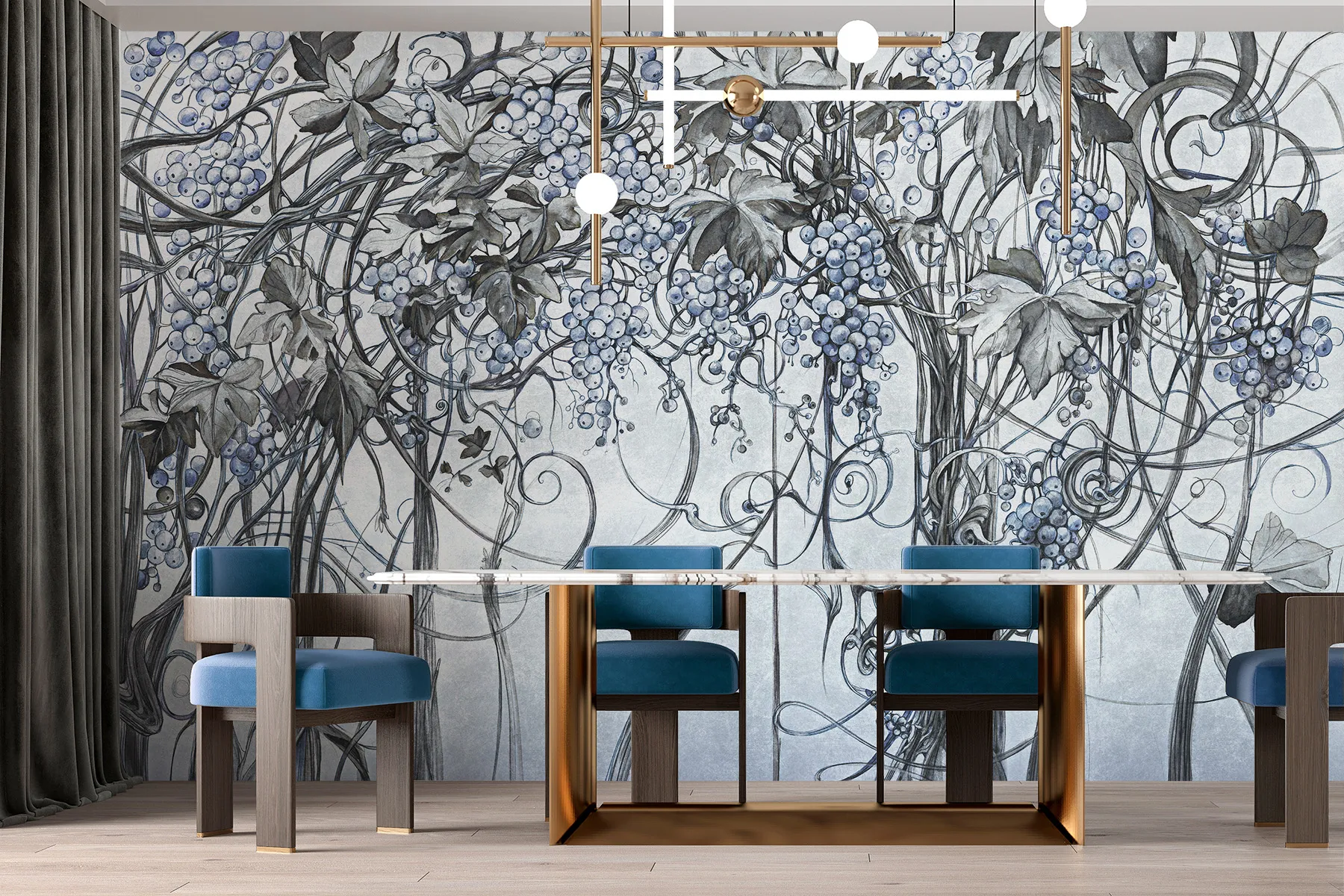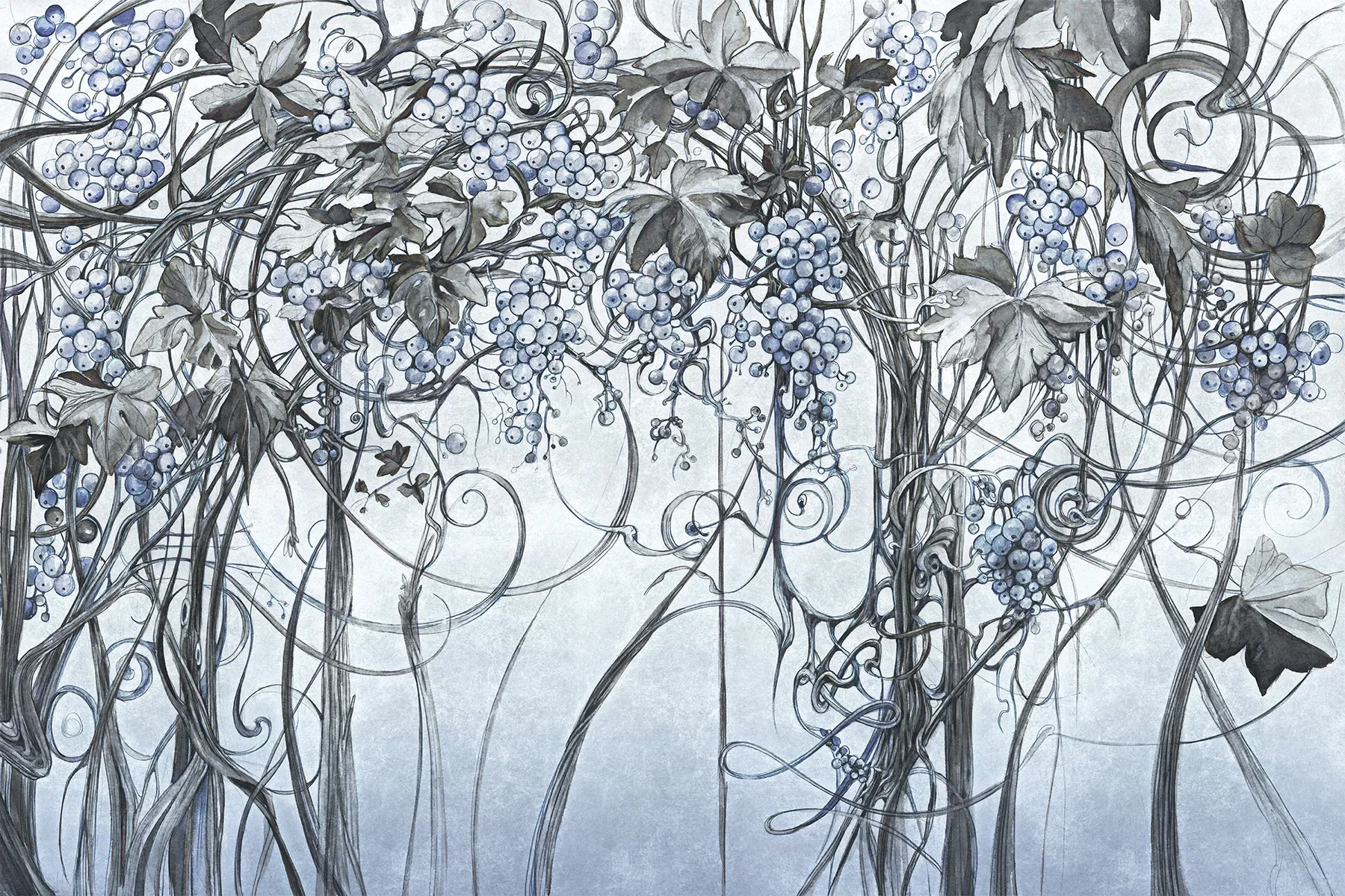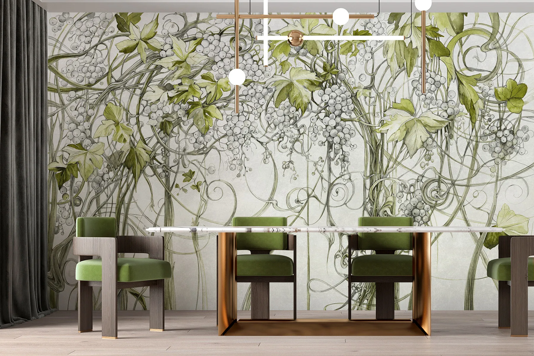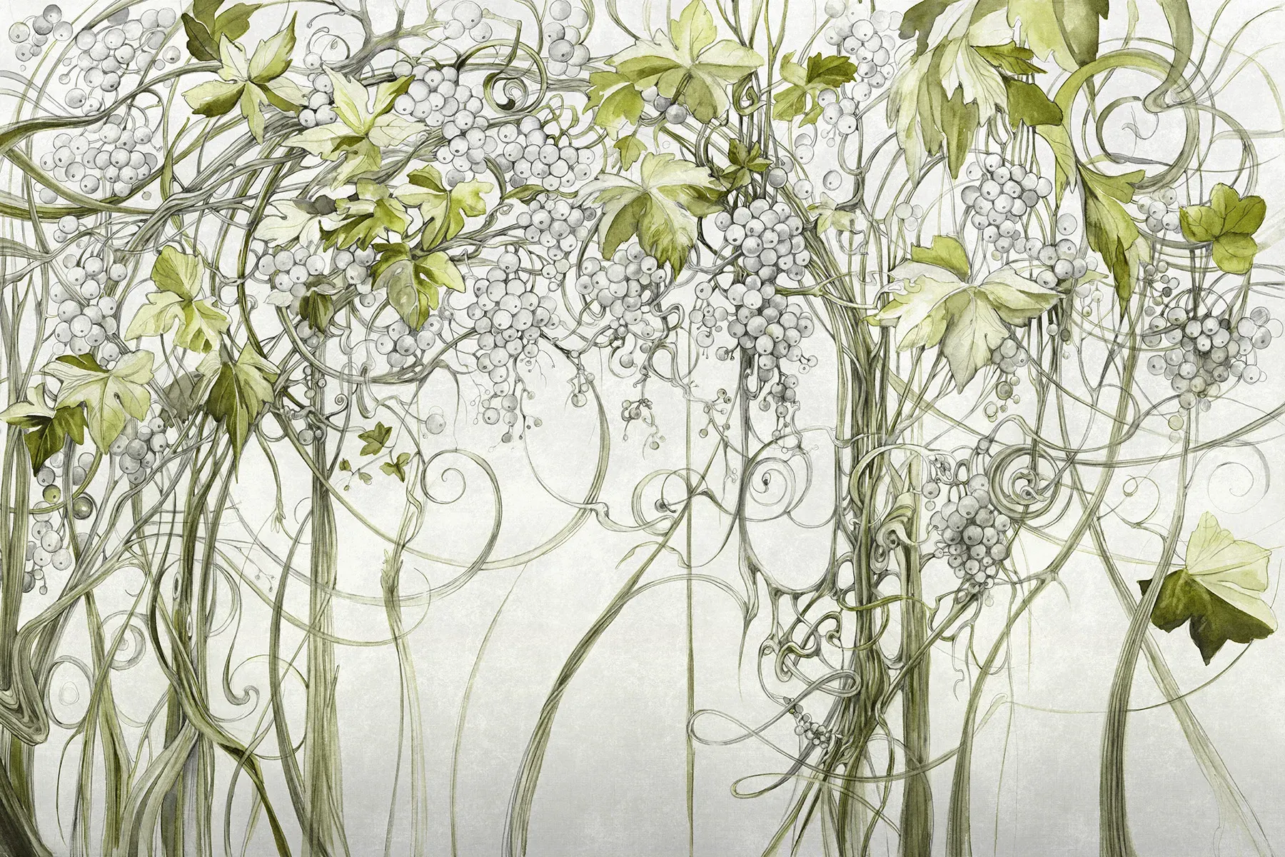 Blätter und Trauben, die Fülle und Leben symbolisieren, bilden eine Komposition voller Frische und Harmonie. Ihre ausdrucksstarken Konturen und die zarten Grün-, Beige- und Blautöne verleihen dem Raum eine angenehme Atmosphäre der Ruhe und Entspannung. Das handgemalte Muster verleiht dem Wandbild eine individuelle Note und macht jedes Detail zum Unikat.