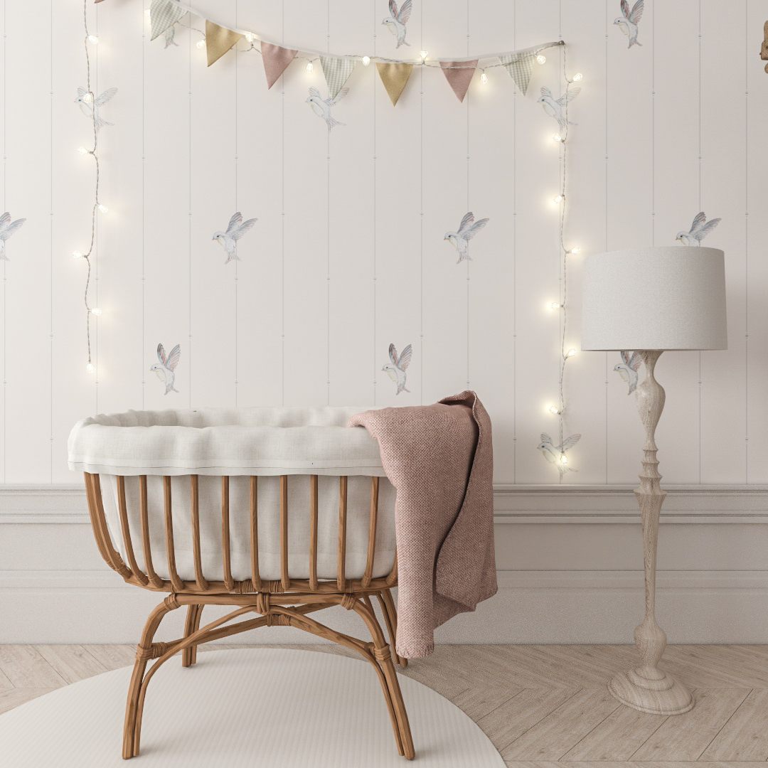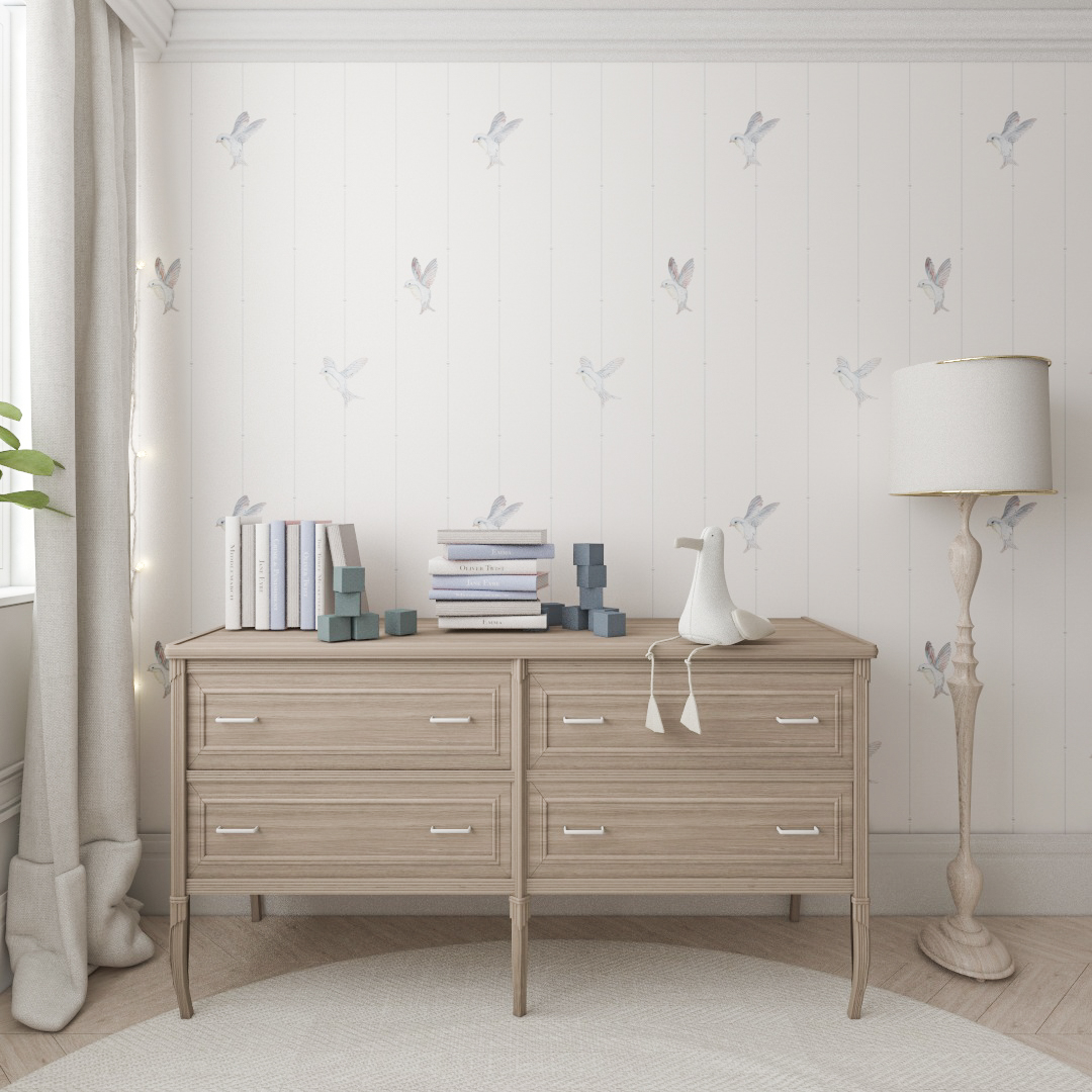 Verleihen Sie Ihrem Interieur eine Atmosphäre der Harmonie und Naturverbundenheit. Diese Vögel-Tapete für Kinder wird zur Kulisse für tausende von ungewöhnlichen Geschichten und Spielen, die die Kreativität und den Sinn für das Schöne anregen. Ihr zeitloser Reiz macht sie zur perfekten Dekoration, die mit Ihrem Kind mitwächst. Das Muster passt perfekt in moderne, minimalistische Umgebungen, und als Landhausstil-Tapete für ein Kinderzimmer bringt es Wärme und eine idyllische Atmosphäre in den Raum. Sie schafft einen sicheren, gemütlichen Zufluchtsort – der perfekte Ort zum Entspannen, Lernen und Träumen von himmelhohen Reisen.