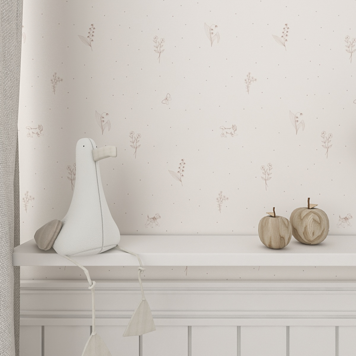 Verleihen Sie dem Zimmer Ihres Kindes einen Hauch von Magie mit der beigen Zweig- und Hundetapete. Dieses subtile und charmante Muster ist die perfekte Wahl für Liebhaber von Naturmotiven und zarten dekorativen Akzenten. Sie eignet sich ideal für Räume, die im rustikalen und modernen Landhausstil eingerichtet sind und schafft eine gemütliche Atmosphäre, die das Zuhause mit Wärme und Harmonie umhüllt.