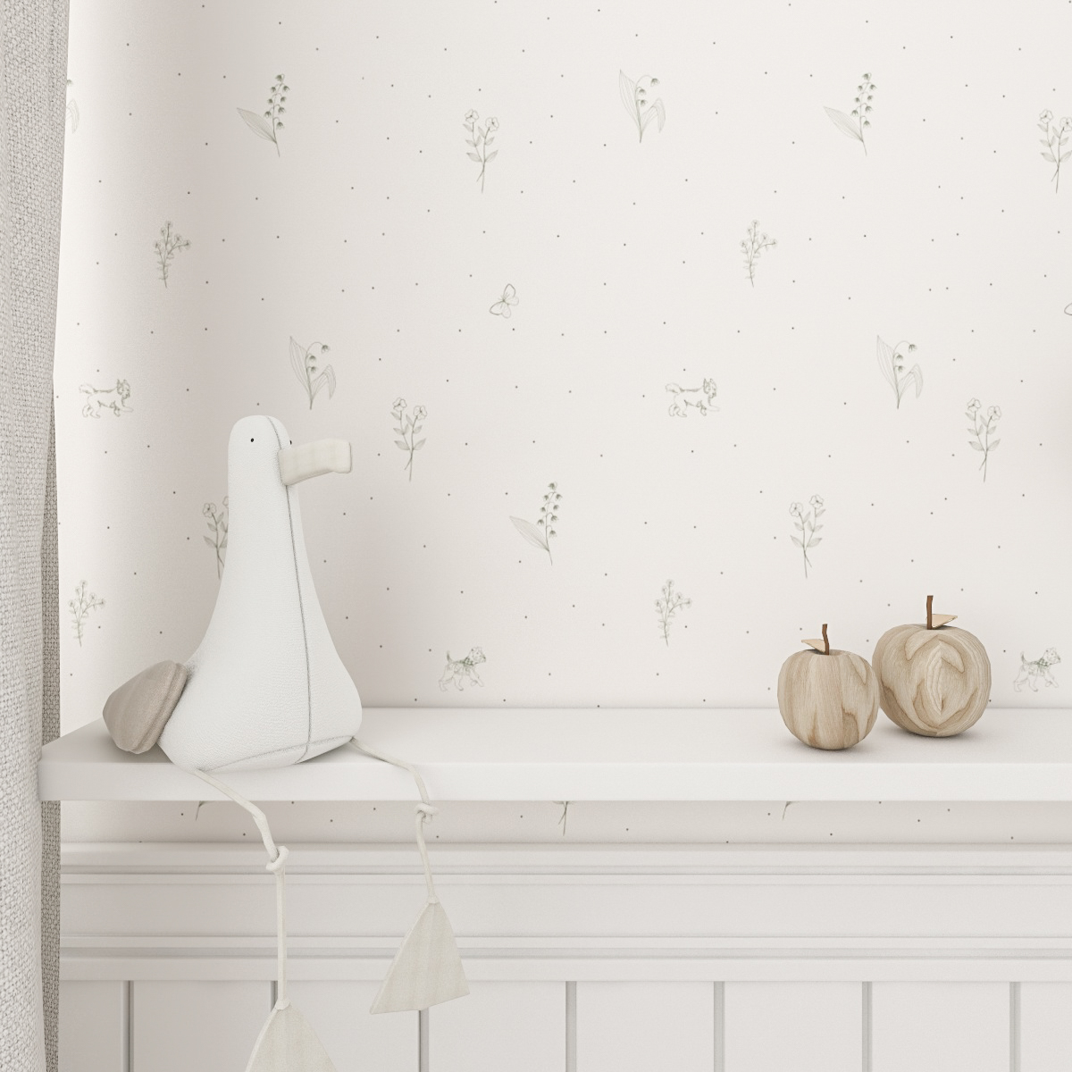 Die fein gemusterte Tapetenkollektion ist eine gute Wahl für viele Kinderzimmer. Das dezente Muster dominiert den Raum nicht und lässt sich gut mit einer Vielzahl von Einrichtungsgegenständen und Designstilen kombinieren. Außerdem sorgt es für eine angenehme, warme und etwas magische Atmosphäre. Zweige, kleine Blumen, niedliche Hündchen und Schmetterlinge – man braucht sie nur anzusehen, um die unbeschwerte Atmosphäre der Kindheit zu spüren.