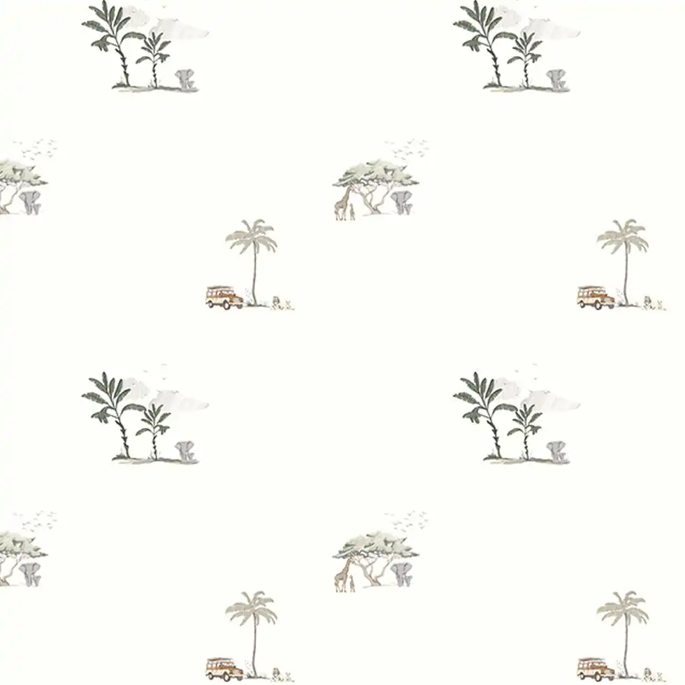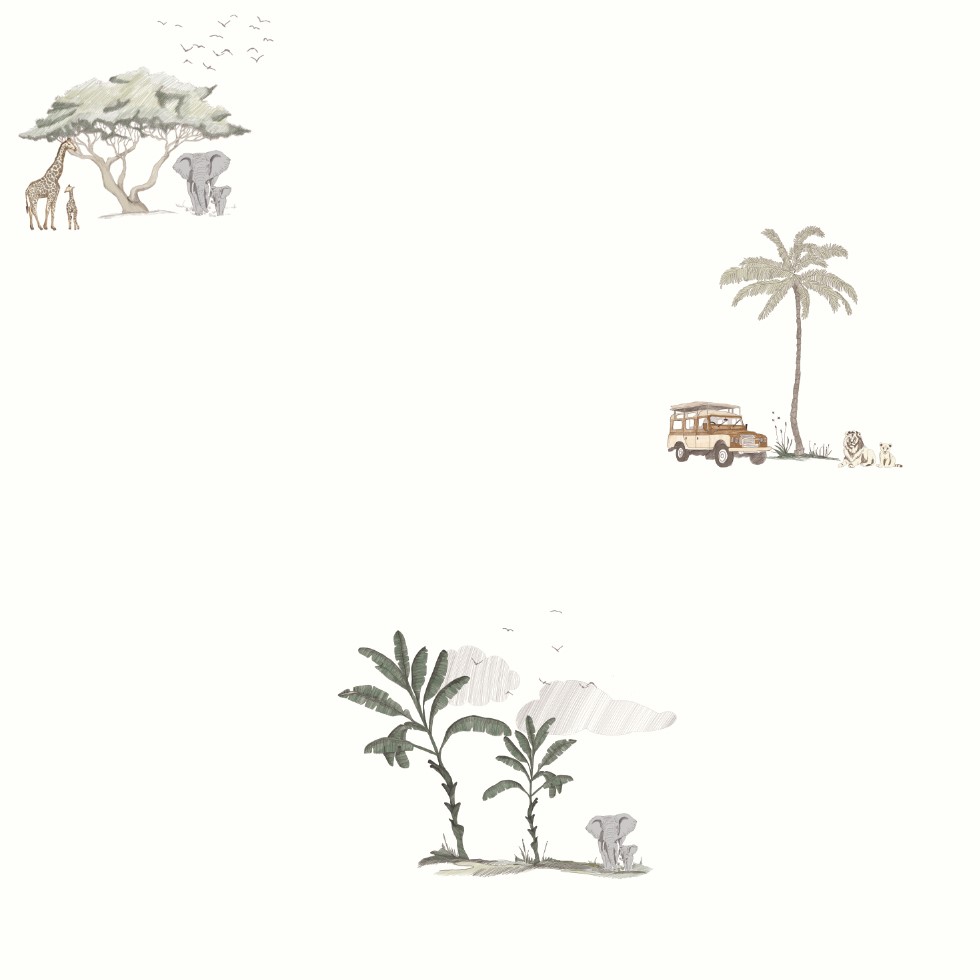 Alle Designs auf dieser Safari-Tapete sind originell und wurden mit einer grafischen Zeichentechnik erstellt, was ihren einzigartigen Charakter noch verstärkt. Jedes Detail, von den Palmenblättern bis hin zu den Tiersilhouetten, ist sorgfältig ausgearbeitet, so dass die Tapete nicht nur eine Dekoration ist, sondern auch ein Element, das die Fantasie des Kindes fördert. Die dezenten Farben und das zarte Muster machen die Tapete auch ideal als Tapete für ein Mädchenzimmer, die eine harmonische und einladende Atmosphäre schafft.
