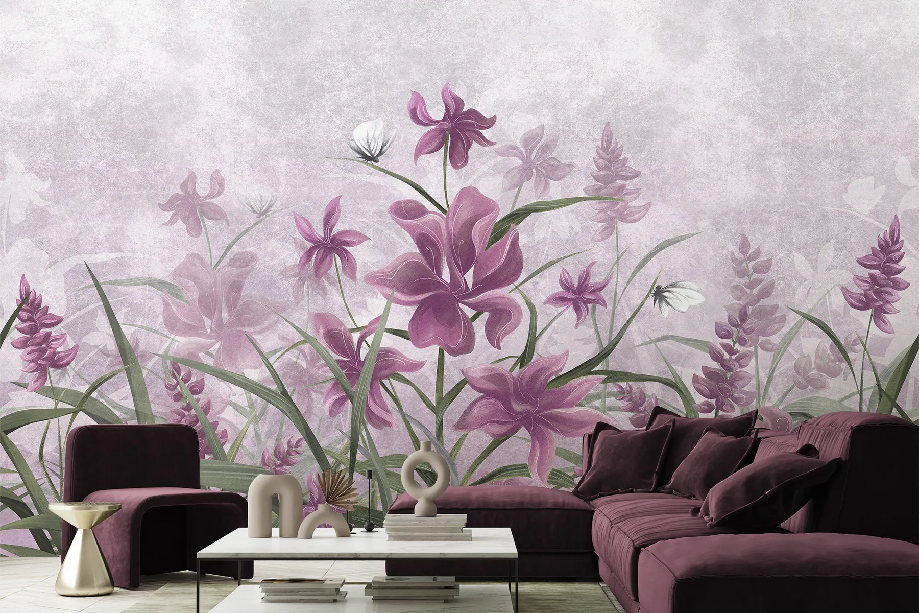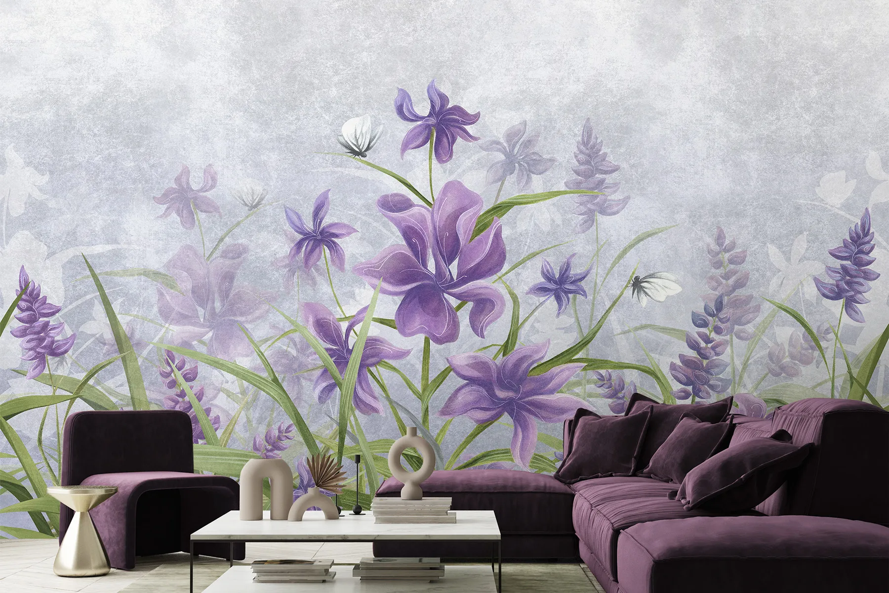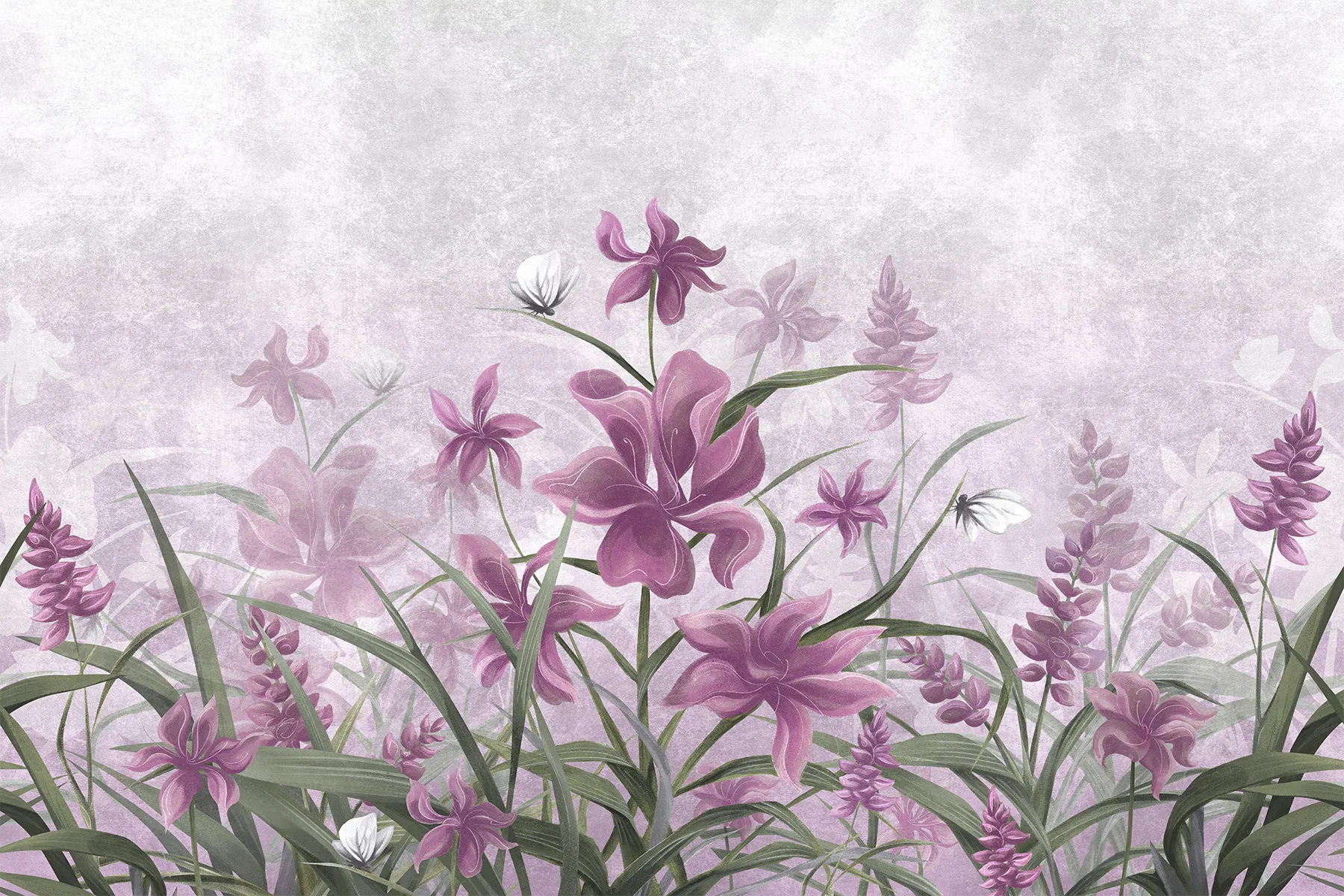 Diese handgemalte Tapete, die violette Irisblüten in einem zarten Muster darstellt, ist die Quintessenz künstlerischer Handwerkskunst und passt perfekt in jeden femininen Raum. Ihr einzigartiges Design und ihr Detailreichtum machen sie zu einer idealen Innendekoration, besonders in einem Mädchenzimmer, wo sie eine Atmosphäre von Verträumtheit und Zartheit schafft.