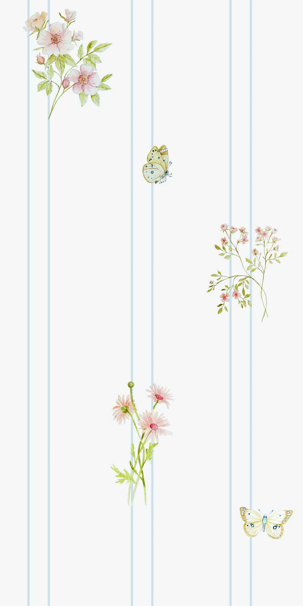 Tapete Blumen, Schmetterlinge und Streifen – auf der Rolle