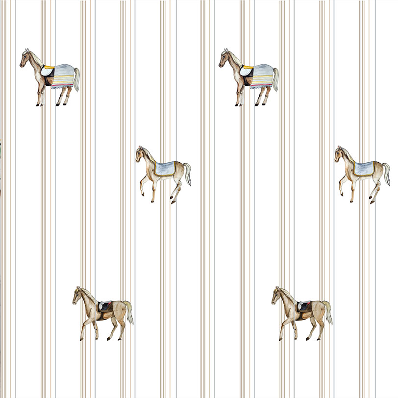 Eine gestreifte Tapete mit Pferden auf einem weißen Hintergrund mit zusätzlichen beigen Streifen. Die Tapete ist ideal für Pferdeliebhaber. Sie ist ein zeitloser Klassiker, der in ein Jungenzimmer, aber auch ins Wohn- oder Schlafzimmer passt.