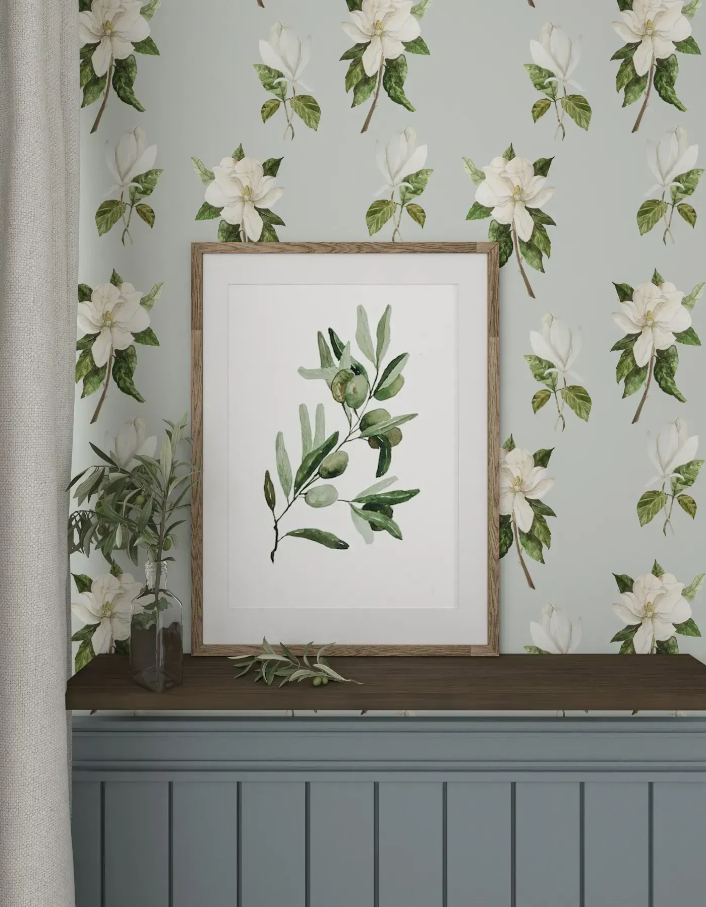 Die Magnolienblüten-Tapete verleiht dem Raum einen energiegeladenen Charakter, perfekt geeignet für die Küche, das Esszimmer oder das Schlafzimmer. Die handgemalten Details machen jedes Stück zu einem Unikat und geben der Einrichtung einen persönlichen, individuellen Charakter.