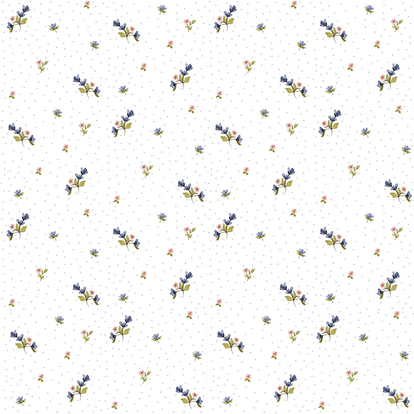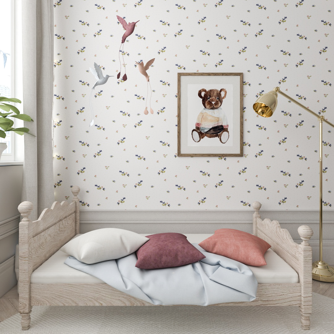 Eine Tapete aus zarten blauen Blumen mit einem Hauch von Teefarbe, die durch Punkte ergänzt werden. Sie ist ein zeitloser Klassiker in einem idyllischen, romantischen Stil, der zu einem Mädchenzimmer passt.