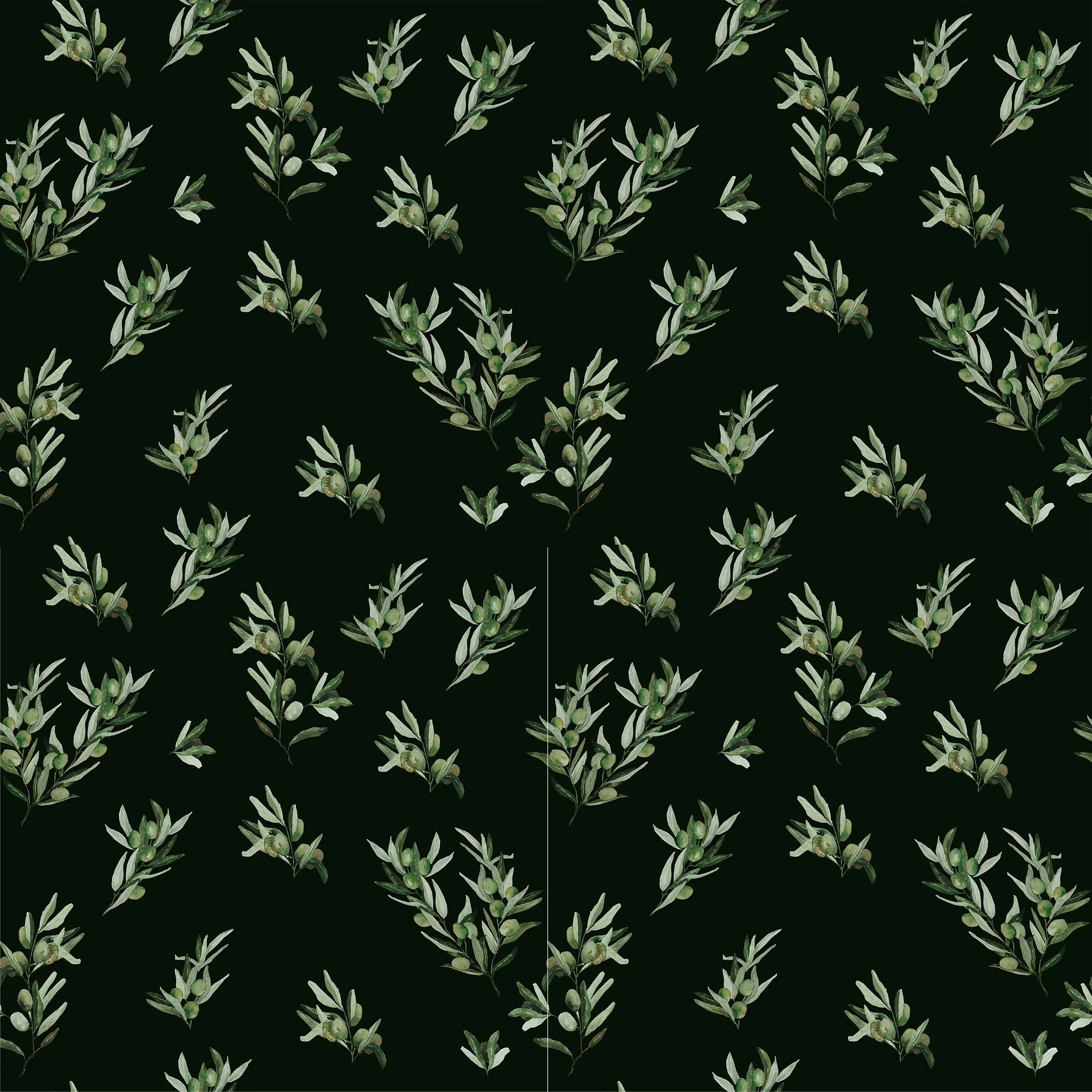 Schwarze Oliventapete verleiht einem Raum einen energischen Touch, perfekt für eine Küche, ein Esszimmer oder einen Freizeitraum. Die handgemalten Details machen jedes Stück zu einem Unikat und verleihen der Einrichtung eine persönliche, individuelle Note.