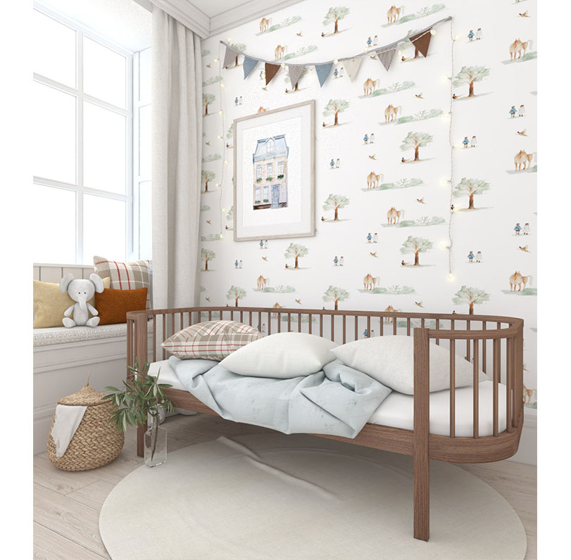 Möchten Sie im Zimmer Ihres Kindes einen Zufluchtsort voller Magie und Frieden schaffen? Unsere Tapete entführt Sie in einen verwunschenen Wald, in dem träumerische Träume auf das sanfte Flüstern der Natur treffen. Entdecken Sie die Geschichte, die auf der Wand geschrieben steht.
