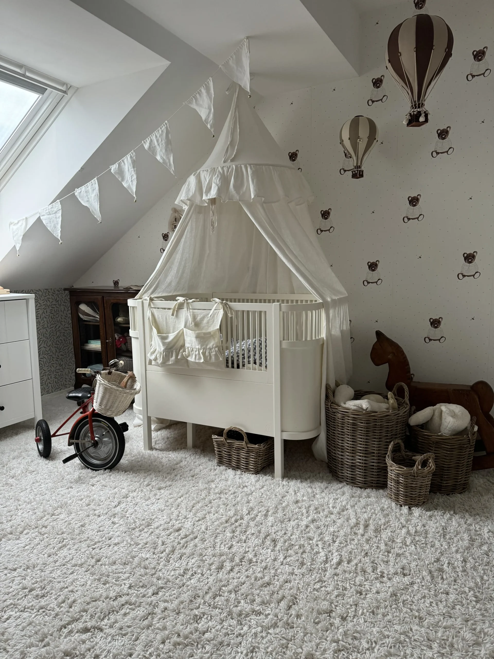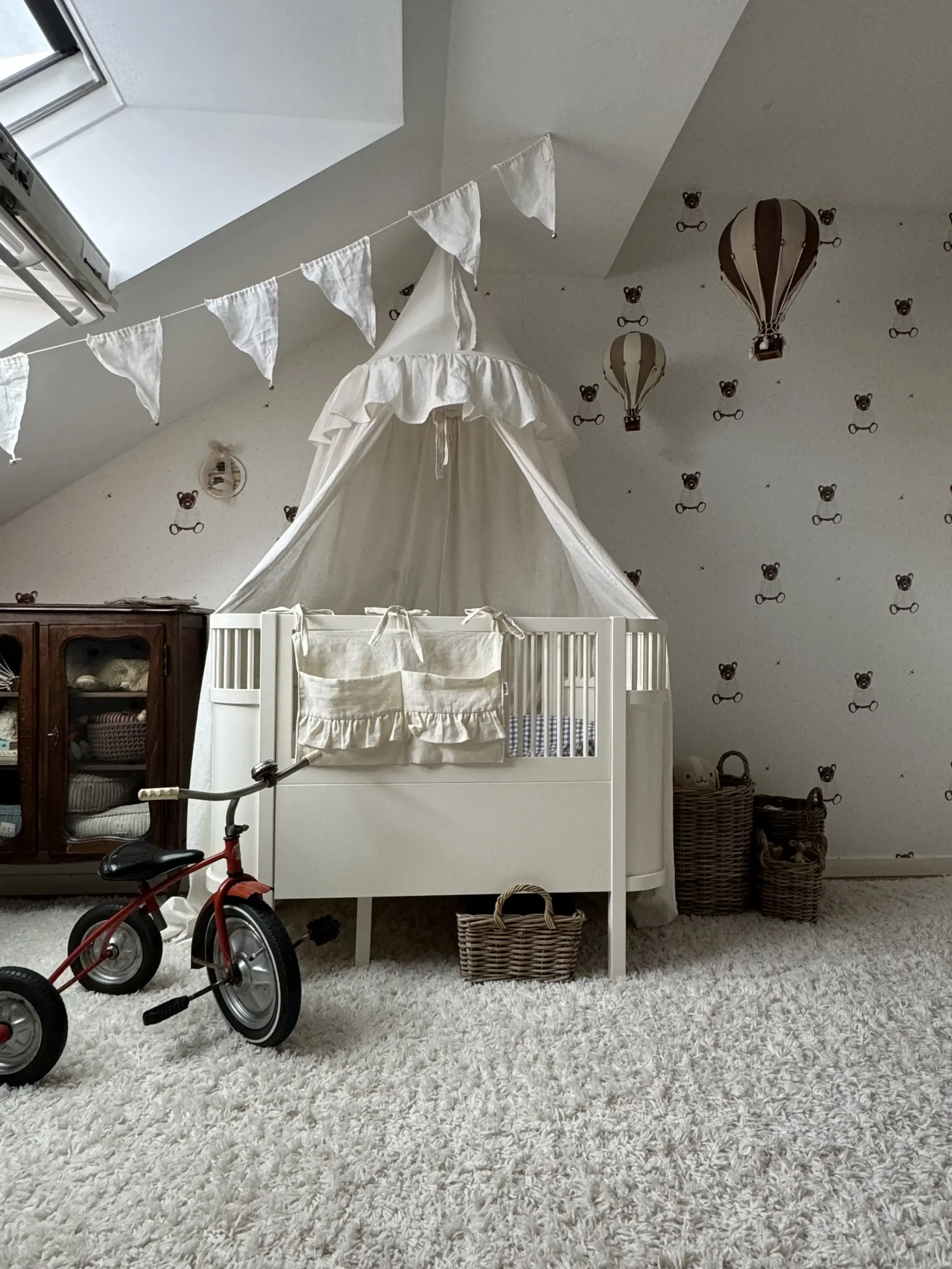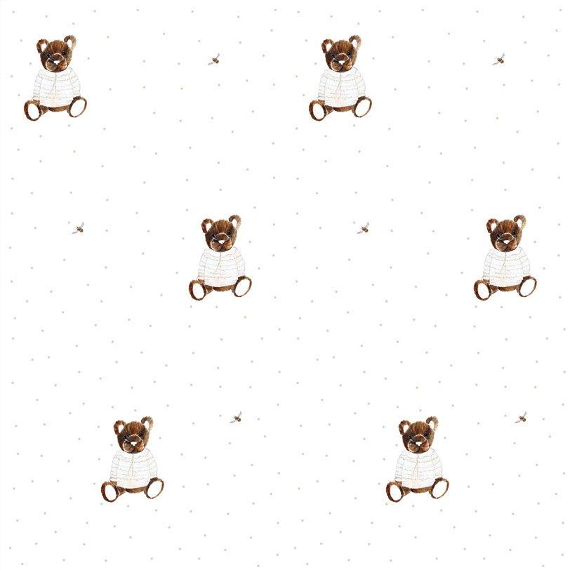 Eine beruhigende Farbpalette und ein natürliches Tapetenmuster mit einem Teddybär und Bienen – schaffen den perfekten Raum für Schlaf und kreatives Spiel