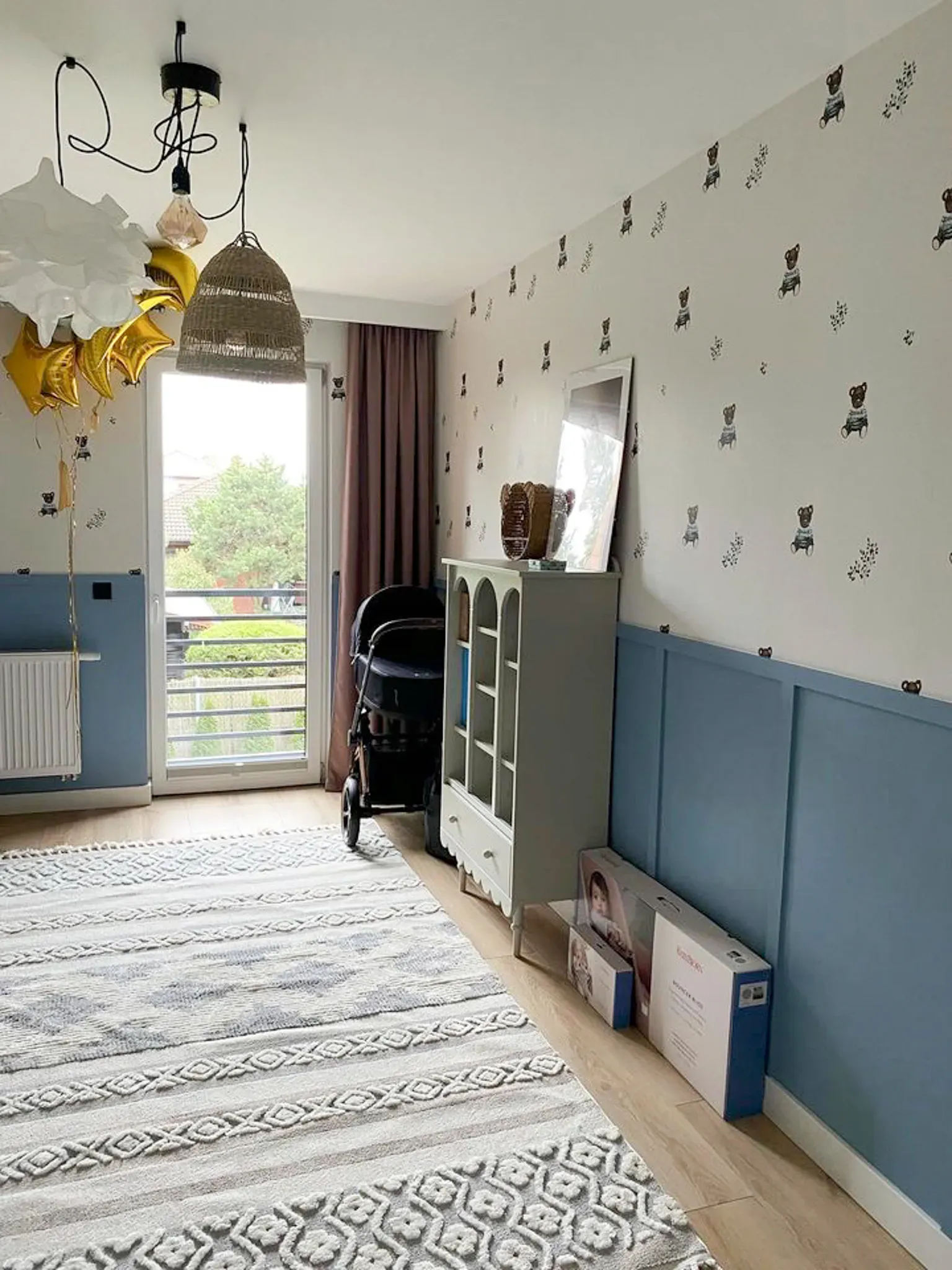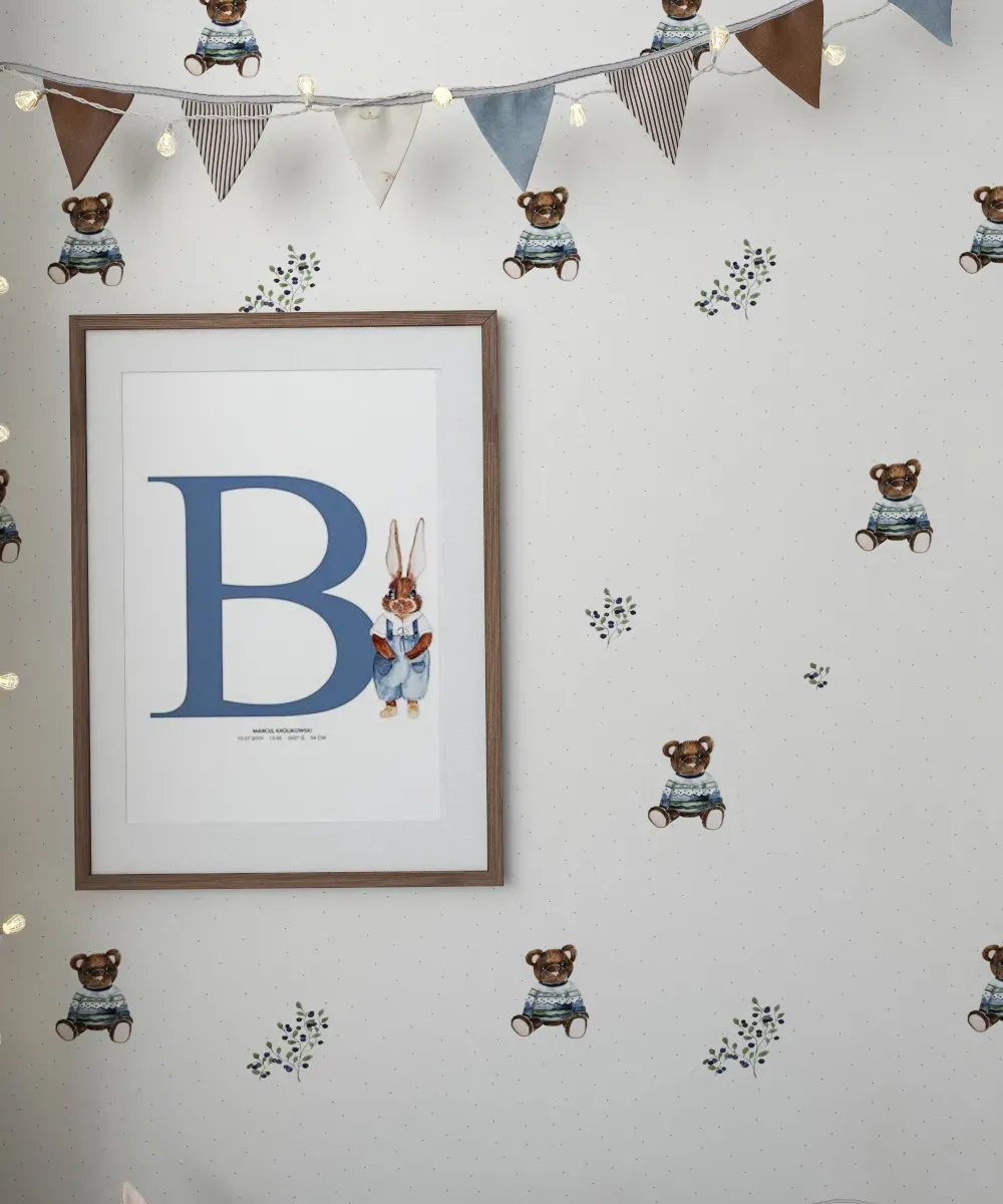 Die Tapeten sind handbemalt. Sie erfreuen und ziehen die Aufmerksamkeit auf sich, schaffen aber auch einen Raum, der zum Spielen und Erfinden von Geschichten anregt, was sich auch auf die Entwicklung des Wortschatzes auswirkt. Die Tapete mit dem Blaubeer-Teddy oder den Tupfen passt in jede Einrichtung eines Kinderzimmers. Sie sieht sowohl in einem klassisch eingerichteten Zimmer als auch im skandinavischen oder Boho-Stil toll aus. Sie können die Tapete mit Hubert Bär an einer Wand anbringen, während auf der gegenüberliegenden Seite die Alinka Bär Kindertapete, die ebenfalls niedlich ist, schön aussehen wird.