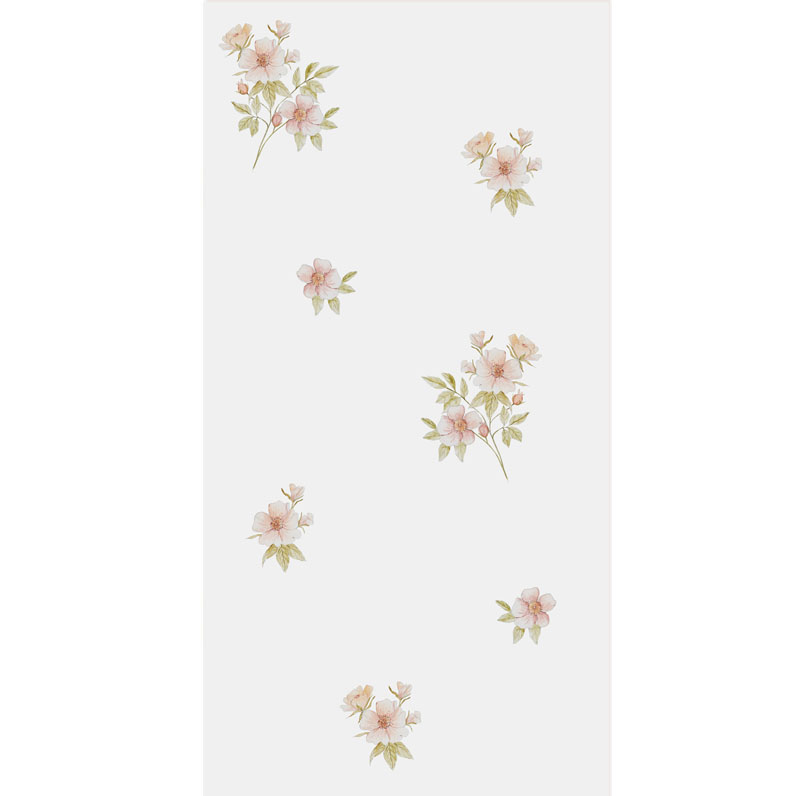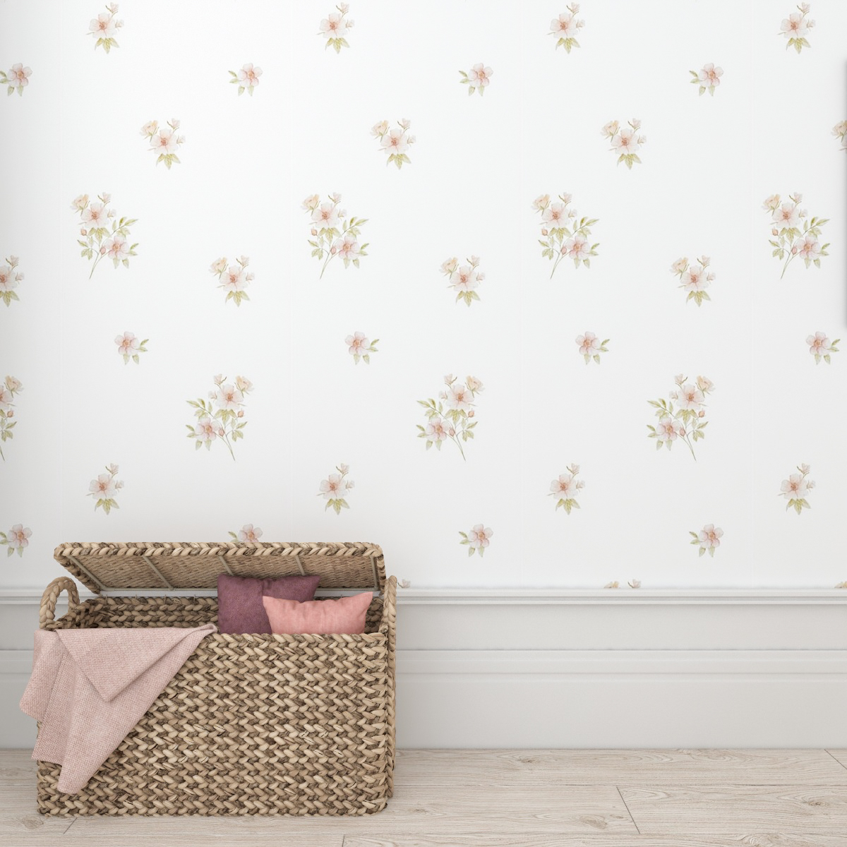 Wollen Sie Ihr Schlafzimmer, Wohnzimmer oder das Zimmer Ihrer Tochter mit einer einzigartigen Tapete mit zartem Blumenmuster dekorieren? Die Teerosen-Wildblumentapete ist einer unserer Vorschläge, der genau das Richtige für Sie ist. Diese romantische, handgemalte Tapete zeigt kleine bezaubernde Blumen mit fünf Blütenblättern und Knospen, die an kleinen Zweigen mit grünen Blättern wachsen. Das schöne, erhabene Muster ist in einer pastelligen Farbgebung gehalten, die beruhigend wirkt und gute Laune macht.