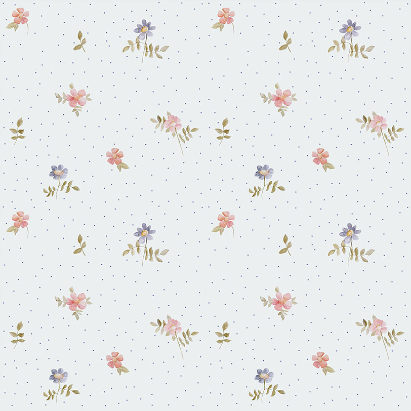Dies ist eine Tapete in Tee und blauen Blumen und Punkten. Sie ist perfekt für ein Mädchenzimmer. Sie wird kein dominantes Gestaltungselement sein, sondern ein schönes und romantisches Detail. Sie lässt sich wunderbar mit vielen Farben kombinieren.
