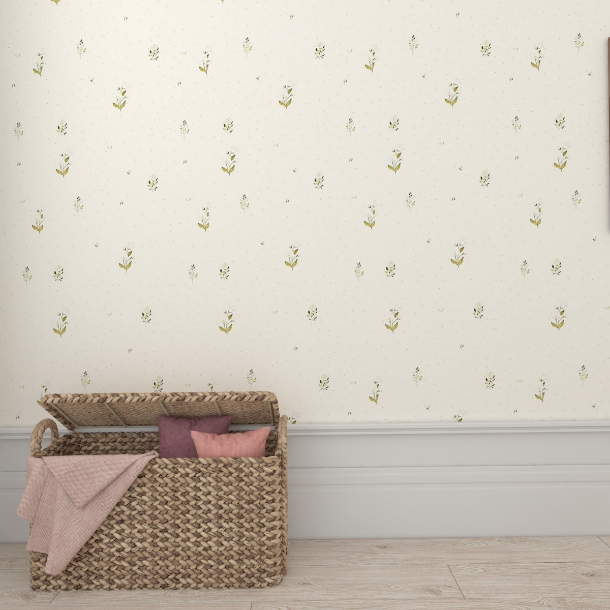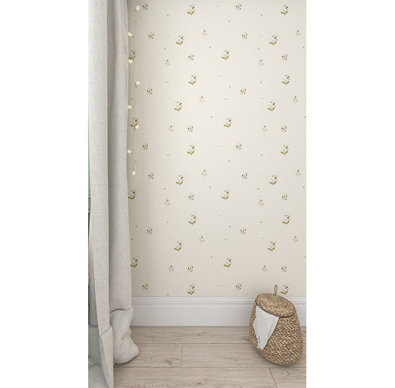 Die weiße Blumentapete ist perfekt für ein Mädchenzimmer 🙂 Sie ist sehr zart, romantisch und mädchenhaft. Sie dominiert den Raum nicht und passt zu vielen Farbkombinationen. Diese Tapete kann sowohl im Zimmer eines Neugeborenen als auch für etwas ältere Mädchen verwendet werden. Diese Art von Motiv ist ideal für Fans einer zeitlosen Inneneinrichtung! Die Tapete ist in fröhlichen Pastellfarben gehalten. Die Farben der Tapete sind Beige, Sand, Grün und Weiß.