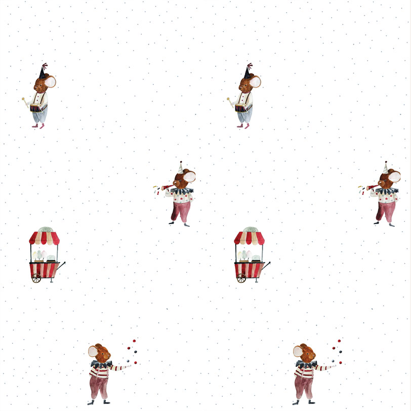 Zirkus-Tapete mit Mäusen und Bonbon-Wagen vor einem Hintergrund aus Punkten